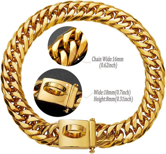 Heavy Duty 18K Gold Dog Big Cuban Collars, Large Medium Small Dogs, 16Mm Wide 16"-26" Thick Stainless Steel Link Necklace, Male Female Bulldog Doberman Dogs